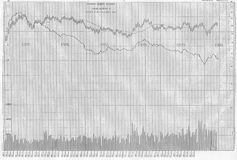 And what about value stocks in 1973; the U. S. Steel's that Putnam were dumping at five times earnings to buy Baxter at fifty times? We had an index called the "Putnam Capacity-Short Average" to track the basic industrial/commodity cyclical sector, which was as depressed an area as you could get in an already-depressed market (in an effort to draw attention to the stocks, we called it the Capacity-Short Average to highlight the fact that many basic industries were running out of excess capacity back then). This, too, is a "real-time" chart from the end of 1974; note its soaring relative strength line during 1973 and 1974 and the fact that the index itself barely broke its 1973 low in 1974 while the DJI was tailspinning from 800 to 580.